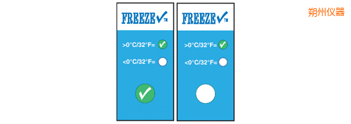 TempDot FreezeCheck標簽,型號54000,用來表示溫度低于0°C。如果溫度低于0°C,,標簽不可逆轉地發(fā)生變化,,變成白色,勾形標記消失。 冷凍檢查標簽用來指示溫度低于0°C. 當溫度下降到低于臨界點, 指示劑不可逆轉的改變從清晰到白色并且綠色合格標志不再顯示。