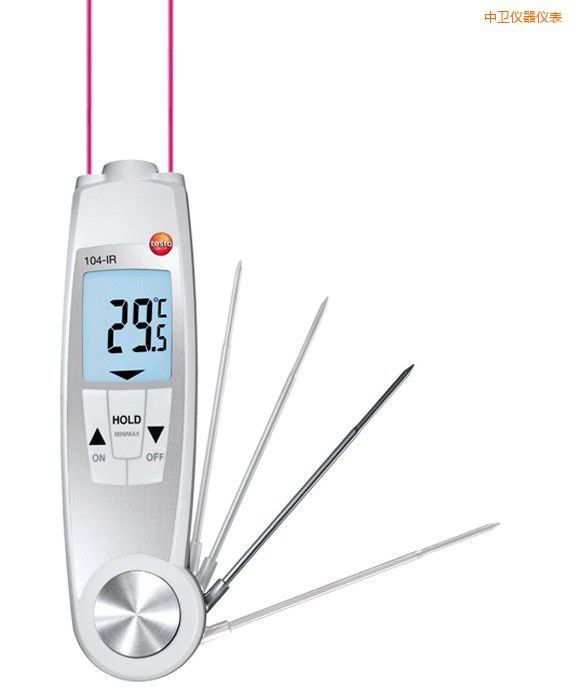 紅外及接觸式測溫二合一testo 104-IR配備精確的2點(diǎn)瞄準(zhǔn)激光,光學(xué)分辨率10:1,溫度計(jì)的量程是,測量范圍清晰可見,溫度計(jì)的測量原理,可隨時(shí)進(jìn)行快速并精確的表面溫度測量。二合一溫度測量儀特別適用于食品進(jìn)貨檢測以及快速檢測單個(gè)或整箱食品的表面溫度。 刺入式溫度探頭適用于測量如肉類和香腸等食品的核心中心溫度。通常,探針溫度計(jì),在紅外表面溫度測量不足以判定食品安全的情況下使用。刺入式探頭在不使用時(shí)可通過折疊方式收入儀器中,溫度計(jì)怎么用,以防折斷損壞。