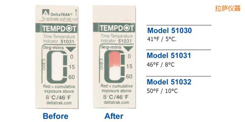 DeltaTrak提供滿足你各種需要的標(biāo)簽:WarmMark溫度標(biāo)簽、高溫?zé)針?biāo)簽和TempDot時(shí)間溫度指示標(biāo)簽顯示溫度變 化超過預(yù)設(shè)的時(shí)間。FreezeCheck和ColdMark溫度標(biāo)簽用于顯示運(yùn)輸溫度低于0℃。商業(yè)洗碗機(jī)使用的TempDot高溫?zé)針?biāo)簽可顯示最終沖 洗水溫是否達(dá)到71℃(HACCP體系所要求的溫度)。 TempDot時(shí)間溫度標(biāo)簽,型號51030-51032,,是一種低成本的標(biāo)簽,可顯示溫度高于閾值長達(dá)60分鐘。當(dāng)溫度超過臨界值,,標(biāo)簽顏色變化開始,但溫度下降到閾值之下時(shí),標(biāo)簽顏色變化停止,如此來顯示累積溫度超過的時(shí)間-,,對于許多質(zhì)保應(yīng)用來說,度分鐘是非常的重要的概念。有三種溫度閾值5℃、8℃和10℃可供選擇。 這個(gè)低成本標(biāo)簽可以指示一段長到60分鐘暴露在臨界點(diǎn)溫度。