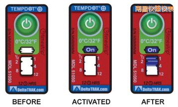 TempDot™Plus標(biāo)簽應(yīng)存儲在室溫下,,并必須在反應(yīng)溫度閾值以上被激活。激活是通過用手指推壓。"On"字出現(xiàn)在第一個窗口中顯示激活。之后5分 鐘內(nèi),,在反應(yīng)溫度或低于反應(yīng)溫度的情況下將標(biāo)簽貼到產(chǎn)品上。藍(lán)色染料熔化并以控制的速率遷移,,經(jīng)過白色大窗口。這表示暴露在溫度閾值以上的累計時間。當(dāng)溫 度低于閾值時,,該染料固化并停止移動。如果溫度超過閾值,TempDot®Plus標(biāo)簽提供即時的視覺跡象。