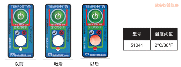 TempDot™ Minus標(biāo)簽需存儲(chǔ)在室溫下,并且必須在反應(yīng)溫度 以上被激活。激活是通過(guò)用手指推壓,標(biāo)簽 底部的小窗口變?yōu)榧t色或部分變紅色以指示激活,但激活后并不需要保持紅色。當(dāng)使用了上述反應(yīng)溫度 標(biāo)簽的產(chǎn)品暴露于閾值以下的溫度,白色的大窗口變?yōu)榧t色或部分紅色,在反應(yīng)溫度 以上將溫度標(biāo)簽用 于產(chǎn)品。如果一個(gè)產(chǎn)品暴露于閾值以下的溫度,白色的大窗口變紅色或部分紅色,TempDot™ Minus標(biāo)簽 提供即時(shí)的視覺(jué)指示。為達(dá)到最佳效果,標(biāo)簽應(yīng)保持垂直位置,,其反應(yīng)期間,,紅色箭頭須指向上方。