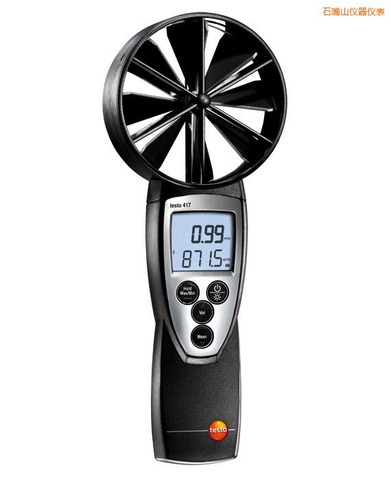 testo 417葉輪風(fēng)速儀 產(chǎn)品介紹:testo 417精密型風(fēng)速儀,便攜式風(fēng)速儀價(jià)格,配置一體式葉輪風(fēng)速/溫度探頭,直徑100mm,德圖葉輪風(fēng)速儀,測(cè)量風(fēng)速、風(fēng)量和溫度。直接顯示體積流量。只需輸入管道的截面積,即可精確計(jì)算出流量。 可以快速切換至當(dāng)前的溫度讀數(shù)。此外,還可以顯示氣流的方向 。儀器帶時(shí)間段和多點(diǎn)平均值計(jì)算功能,風(fēng)速儀檢定規(guī)程,計(jì)算風(fēng)量、風(fēng)速和溫度的平均值。用戶可選配風(fēng)量罩,熱式風(fēng)速儀,有助于更好地檢測(cè)格柵出風(fēng)口和風(fēng)閥處的風(fēng)量。 儀器可以顯示最大值/最小值。使用保持鍵,起重機(jī)風(fēng)速儀,可以保持當(dāng)前讀數(shù)。 testo 417葉輪風(fēng)速儀 優(yōu)點(diǎn):· 識(shí)別氣流的流向· 測(cè)量溫度、風(fēng)速和風(fēng)量 · 時(shí)間段/多點(diǎn)平均值計(jì)算 · 顯示最大值/最小值 · 保持鍵,熱敏風(fēng)速計(jì),保持讀數(shù) · 顯示屏帶背光燈 · 自動(dòng)關(guān)機(jī)功能 · 100mm直徑的一體式葉輪 testo 417葉輪風(fēng)速儀 附件 - testo 417